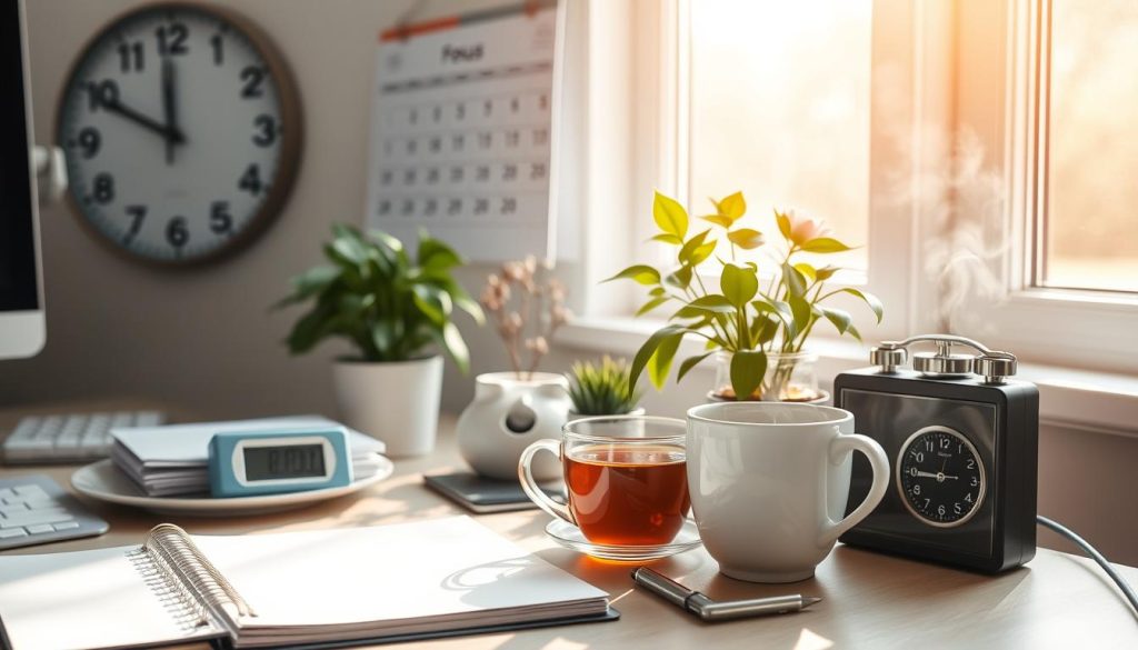 Having the right tools and techniques is important for time management. Productivity Hacks like the Pomodoro Technique and time blocking keep you on track. Also, Stress Management Techniques such as meditation and exercise help you stay calm and balanced.