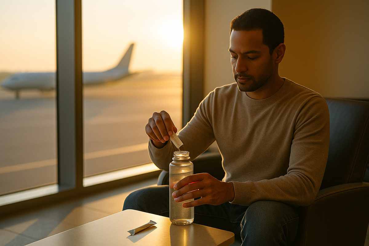 There is no complicated choreography here. The travel days that feel the best usually follow a steady rhythm: hydrate, move gently, get daylight, keep meals simple, and take your supplement at roughly the same time each day.